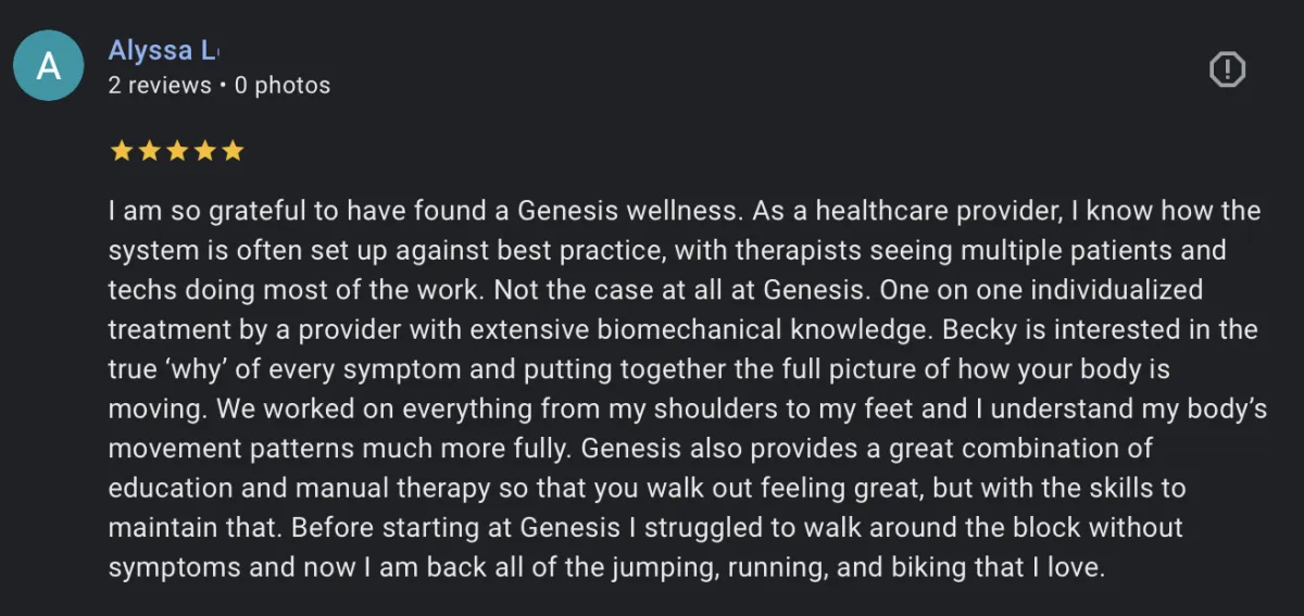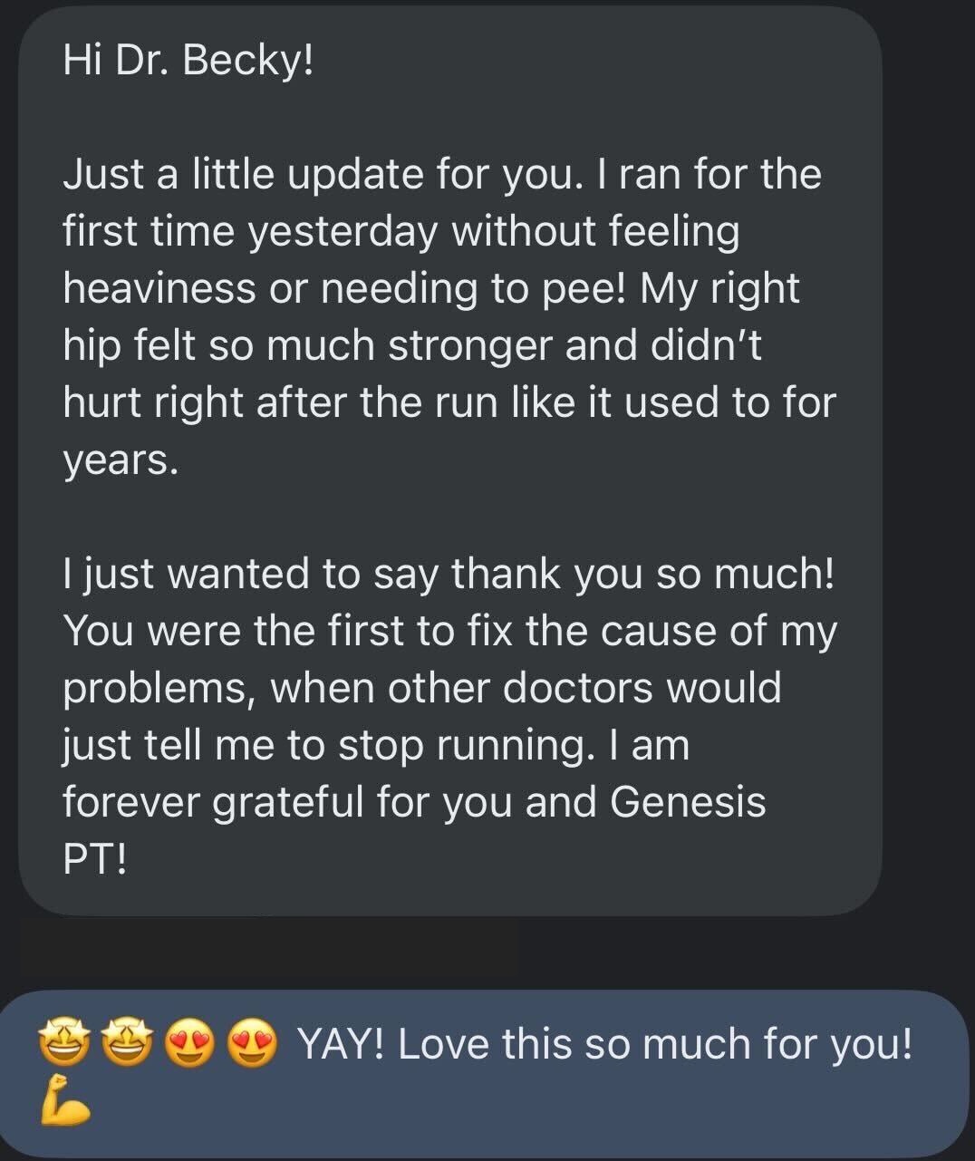 “I started going to Genesis PT May of 2024 and I can truly say it’s been life changing for me. I enjoy running and noticed postpartum that things felt different. After telling Dr. Becky all the problems I had, she came up with a detailed plan for me and with each visit she has addressed issues in my pelvis, hips, back, and feet. She got me back to running and feeling stronger than have ever felt before! I will forever be a walking billboard for Dr. Becky and Genesis PT & Wellness!” - Cara