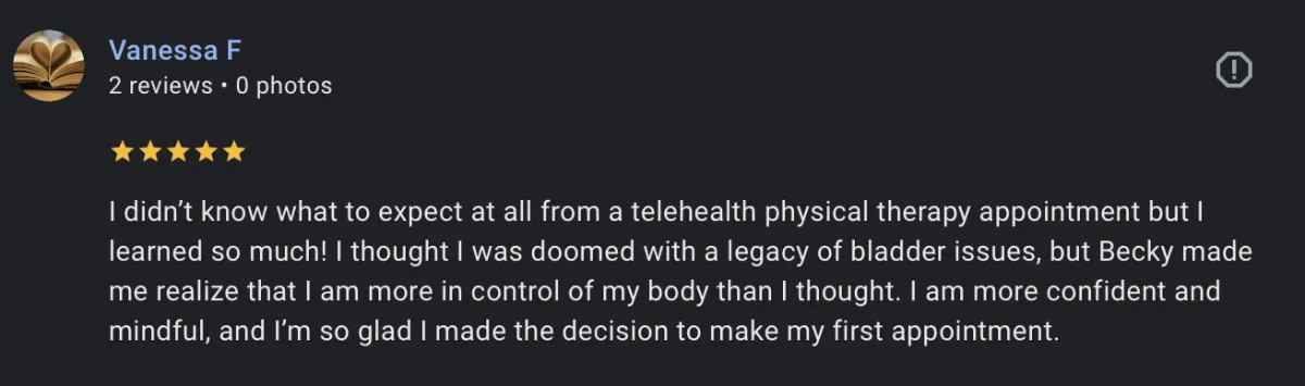“Becky is amazing! After just two Telehealth meetings I am seeing improvements. The interventions for pelvic floor health she implements are easy and effective”. - Carmen