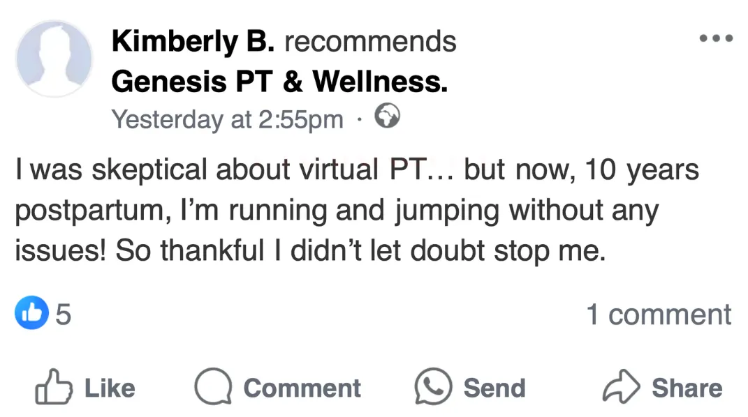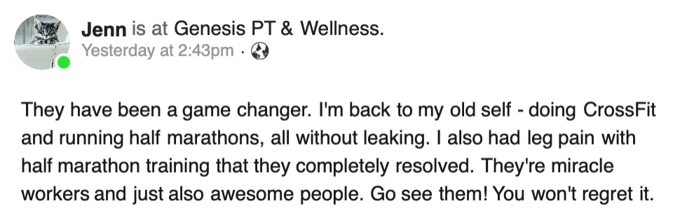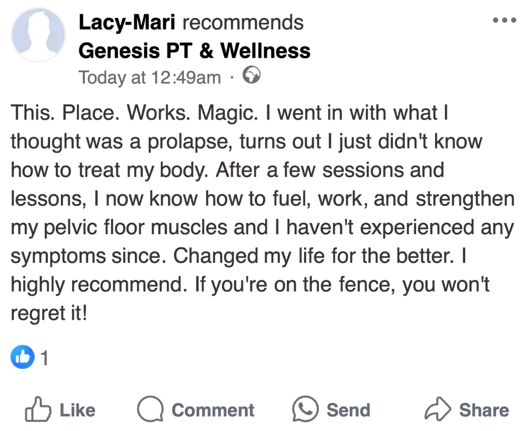 “So so grateful for Genesis PT! ... I have been able to learn how to breathe correctly, notice where I'm holding tension in my body, and feel confident in exercising after experiencing prolapse symptoms postpartum. Every woman needs to a pelvic floor therapist and Genesis has the best of the best!” - Abigail